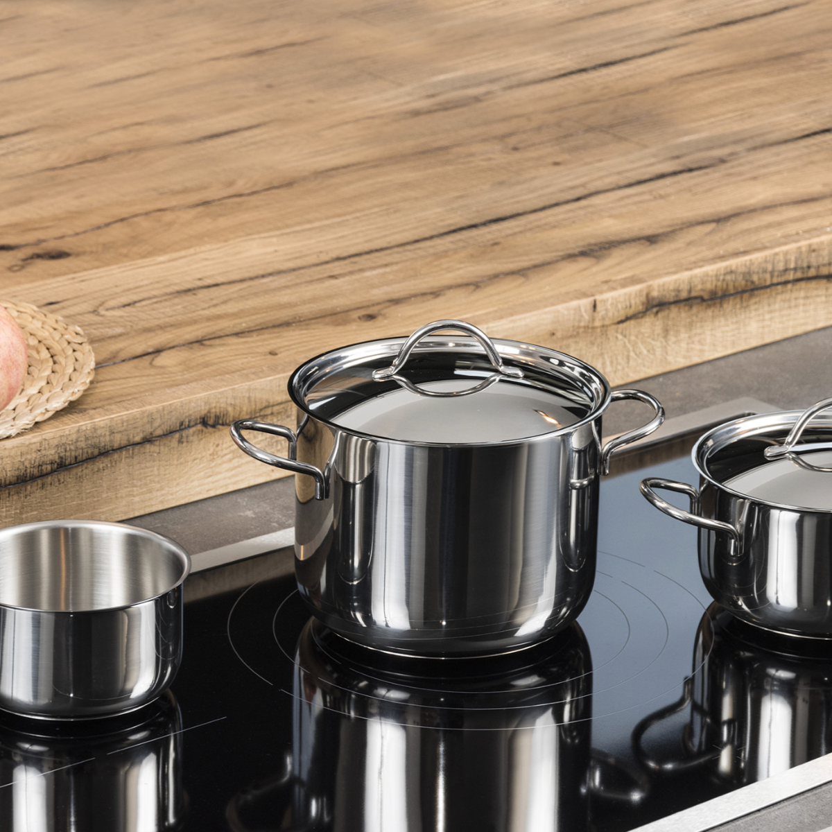 Состав набора: кастрюля высокая 4,6 л, кастрюля 2,3 л, кастрюля 3,8 л, сотейник 2,6 л, ковш 1,1 л, крышки 14, 18, 20 и 22 см. Cuocimania - набор посуды из высококачественной нержавеющей стали 18/10. З-х слойное дно (сталь-алюминий-сталь) гарантирует высокую эффективность приготовления и долговечность. Подходит для индукции, минимизирует риск прилипания пищевых продуктов. Большие ручки с мягкими линиями обеспечивают прочный и надежный захват.